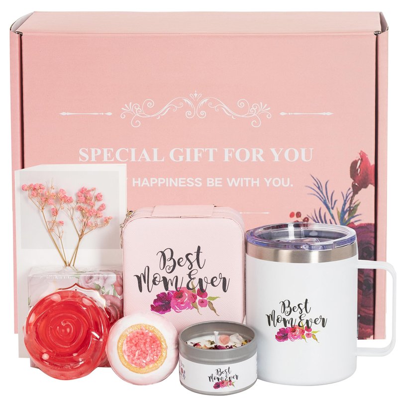 - 6 in 1 Luxury Gifts for Women - Each gift box contains 1 x 12 oz Handle Stainless Steel Insulated Travel Tumbler written with "Best mom ever". 1x Jewelry Accessory Box, 1 x Rose scented candles, 1 x 100g rose handmade soap with net, 1 x bath bombs,1 x greeting card. The moment the box is opened, it can bring her a great surprise.