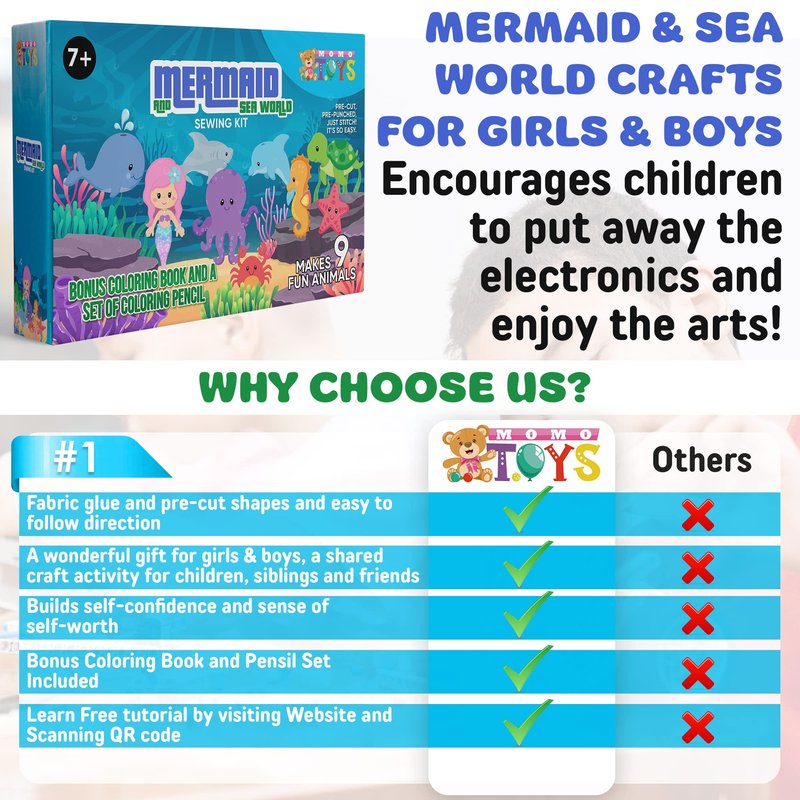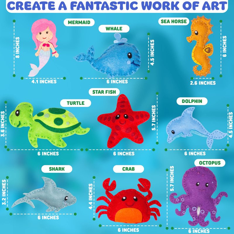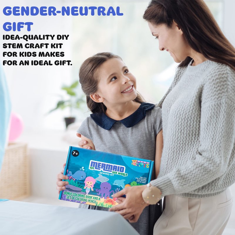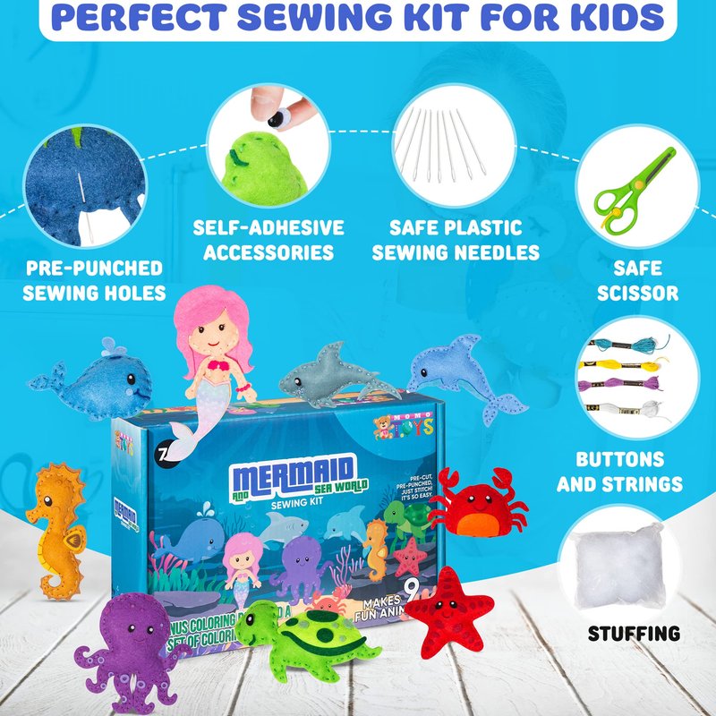 - ๐งโโ๏ธ PERFECT FOR YOUNG CREATIVES: Our mermaid and sealife world sewing kit for kids ages 8-12 includes all the tools and materials needed for fun. Includes 9 felt characters, 9 colors of embroidery thread, 2 needle threaders, 1 pencil color set, stuffing (1.06 oz/30g), 1 coloring book, and easy instructions to guide them through the process. Additionally, it includes 1 safety scissors for safe crafting. It's an ideal way to introduce children to crafting and sewing and skill development.
