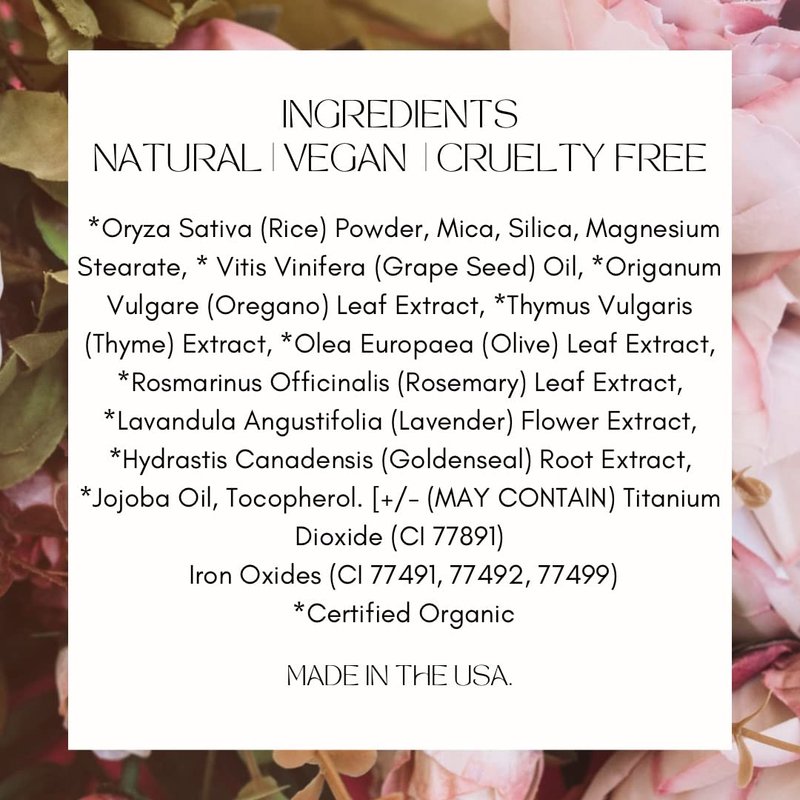 - All Natural * 75% Organic * Vegan * Gluten Free * Cruelty Free * Made in the USA