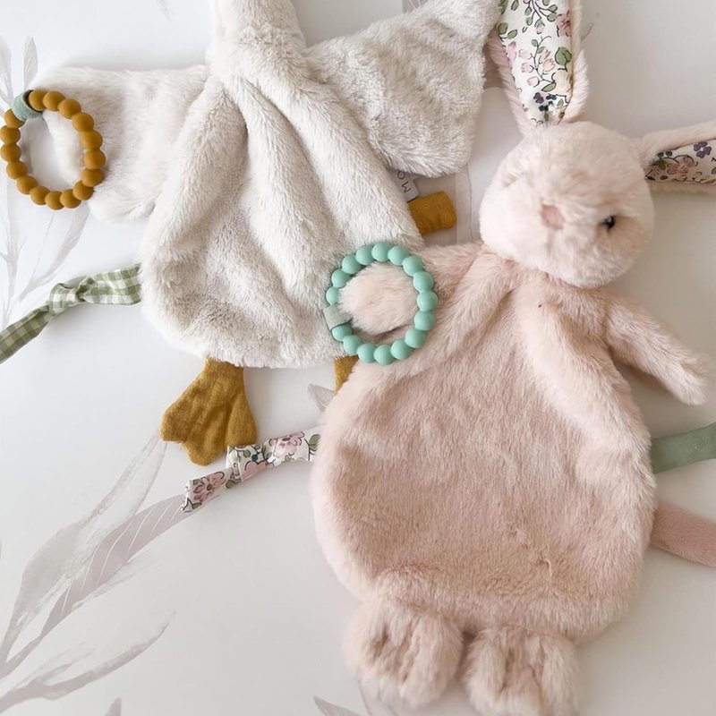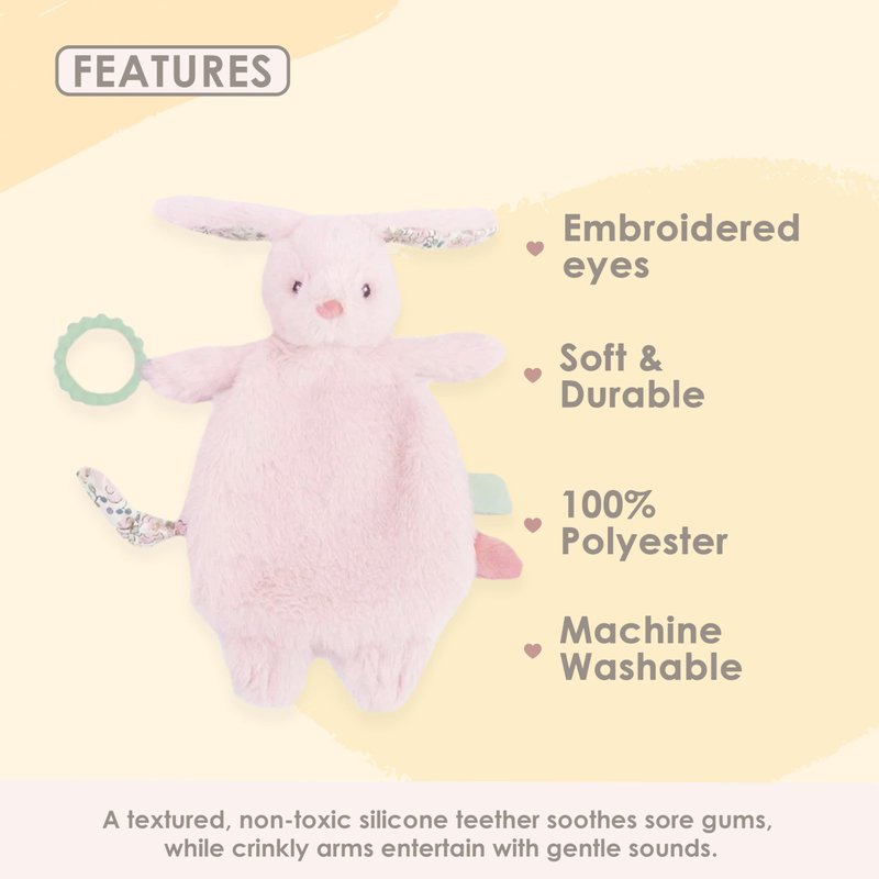 - SOFT TEETHER BLANKIE - Rosie Bunny is here to make teething a lot easier! Mon Ami's lovey plush and silicon teether toy helps baby navigate this rocky milestone like a champ. A textured, non-toxic silicon teether massages and soothes sore gums while crinkly arms keep a little one entertained with their gentle sound. Crafted of ultra-soft velour and fabric tabs, our Bunny lovey plush toy serves as the ideal snuggle buddy.