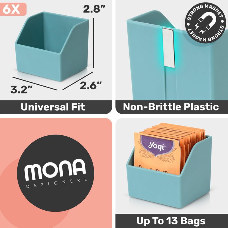 Mona Magnetic Tea Bag Organizer - Set of 6 Individual Tea Bag Holders for The Refrigerator, Counter or Kitchen Shelf. Stylish & Practical Space Saving Tea Organizer for Tea Display (Sage)
