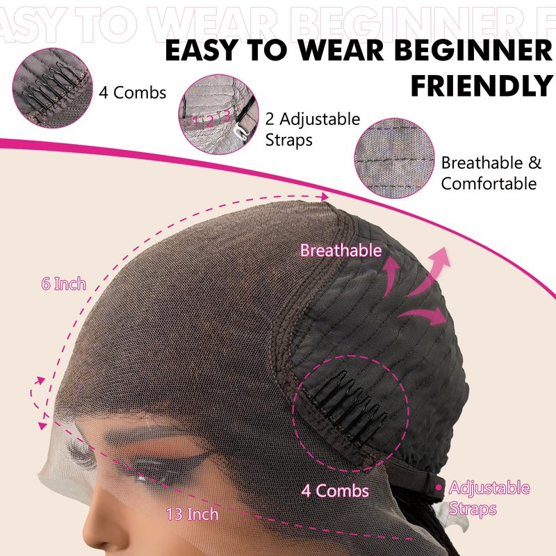 - Human Hair Wigs Cap: Wigs human hair cap is medium size (22-23.5 inch) flexible cap with 2 adjustable straps and 4 combs; 3 positions adjust the elasticity of cap can fit most people's heads; the soft and breathable lace fabric adds to the comforty
