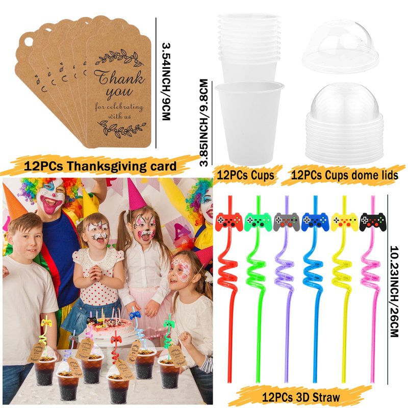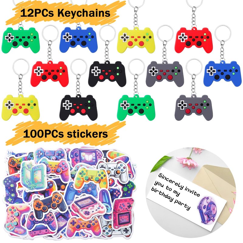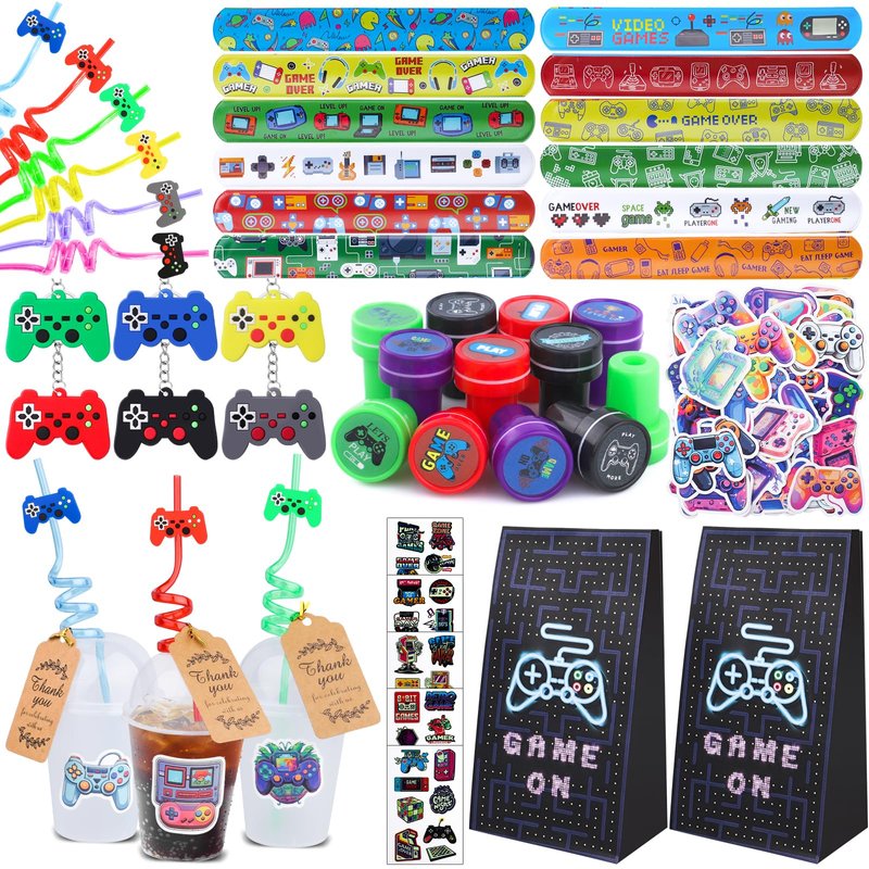 - Video Game Party favors - Included 12pcs Video Game keychains, 12pcs Video Game slap bracelets, 12pcs Video Game stampers, 12pcs Video Game Tattoos, 100pcs Video Game Stickers, 12pcs straws, 12pcs cups, 12pcs bags, 12pcs thanksgiving cards, rich combination and sufficient quantity enough to meet your party needs.
