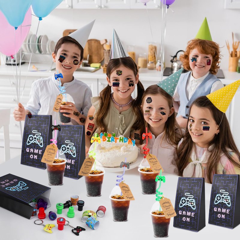 - DIY Set - You can decorate the cups with our video game stickers, then put the controller keychains, stamps, slap bracelets and other small items into the cups, close the lid, insert cute straws, tie the thank you cards, to create a novelty party favor for your friends, which will bring much fun to your game themed party.