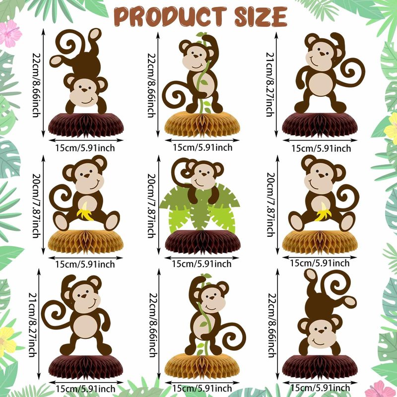 • PACKAGE INCLUDED - You will get 9 pcs monkey honeycomb centerpieces with 5 different shapes of lively monkeys and 9 pieces honeycomb bases.cute 3D design and suitable as table decoration for jungle safari wild animals monkey hawaiian luau themed party.