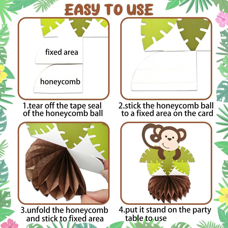 • EASY TO ASSEMBLE - The monkey honeycomb centerpieces,tear off the sticker and stick it on the card,easy to use.in order to avoid falling or being blown away,better to stick the bottom at the same time,so that they can stand more firmly.
