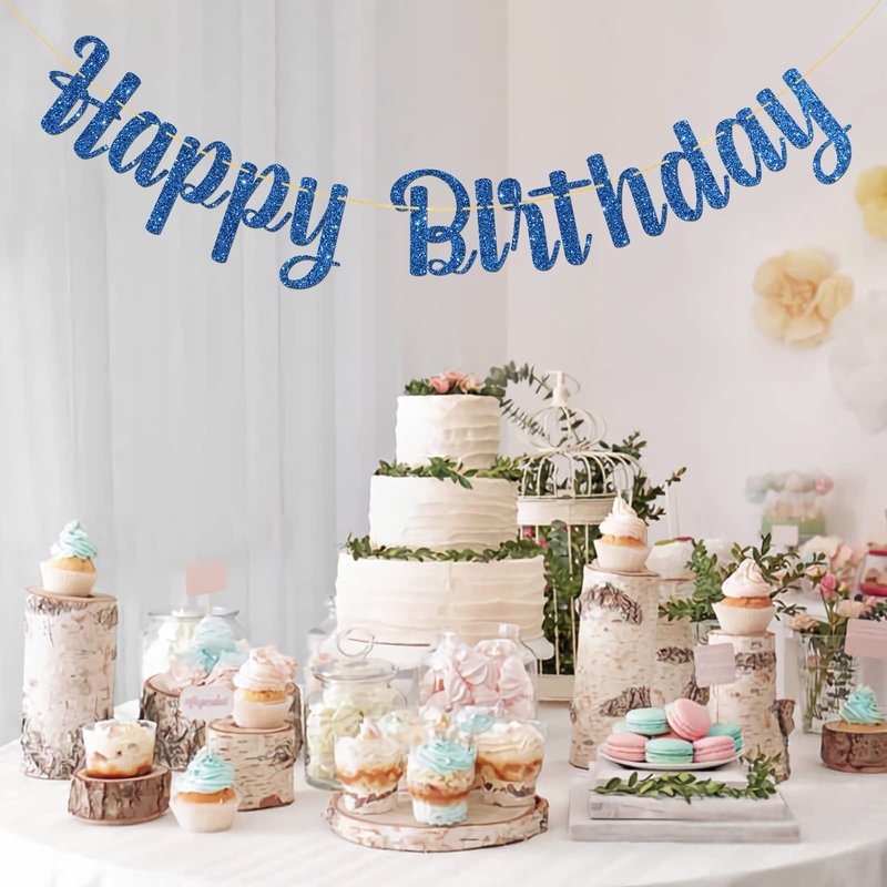 MonMon & Craft Happy Birthday Banner/Children Adults Boys Girls Birthday Party Decor/Birthday Party Decorations Blue Glitter