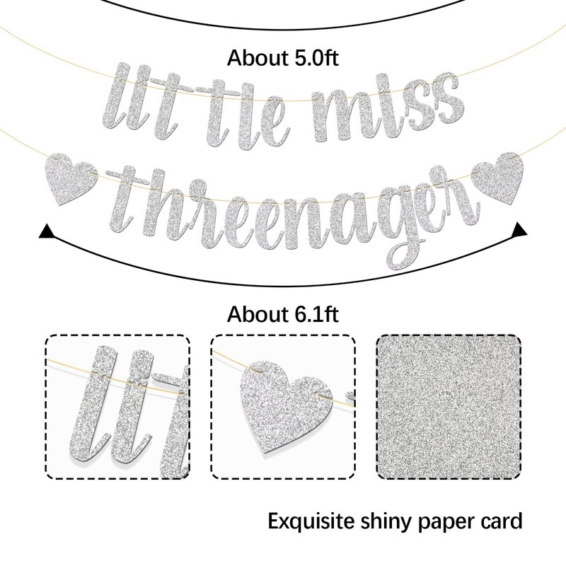 MonMon & Craft Little Miss Threenager Banner/Children Girl 3rd Birthday Party/Hello Three Sign/Little Girl Three Years Old Birthday Party Decorations - Silver Glitter