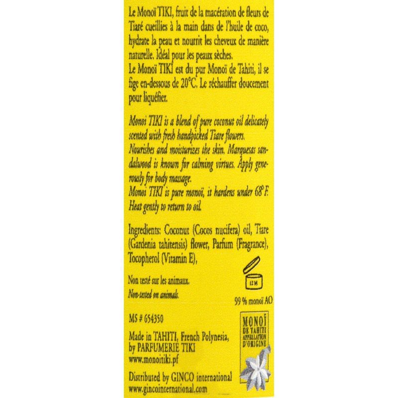 The Monoï with the Flower 100% Made in Tahiti Since 1942 No Parabens, Natural Anti-Oxidant Agent Non-Tested On Animals Monoi Tiki is a blend of pure coconut oil delicately scented with fresh handpicked Tiare flowers. Nourishes and moisturizes the skin. Marquesas sandalwood is known for calming virtues.