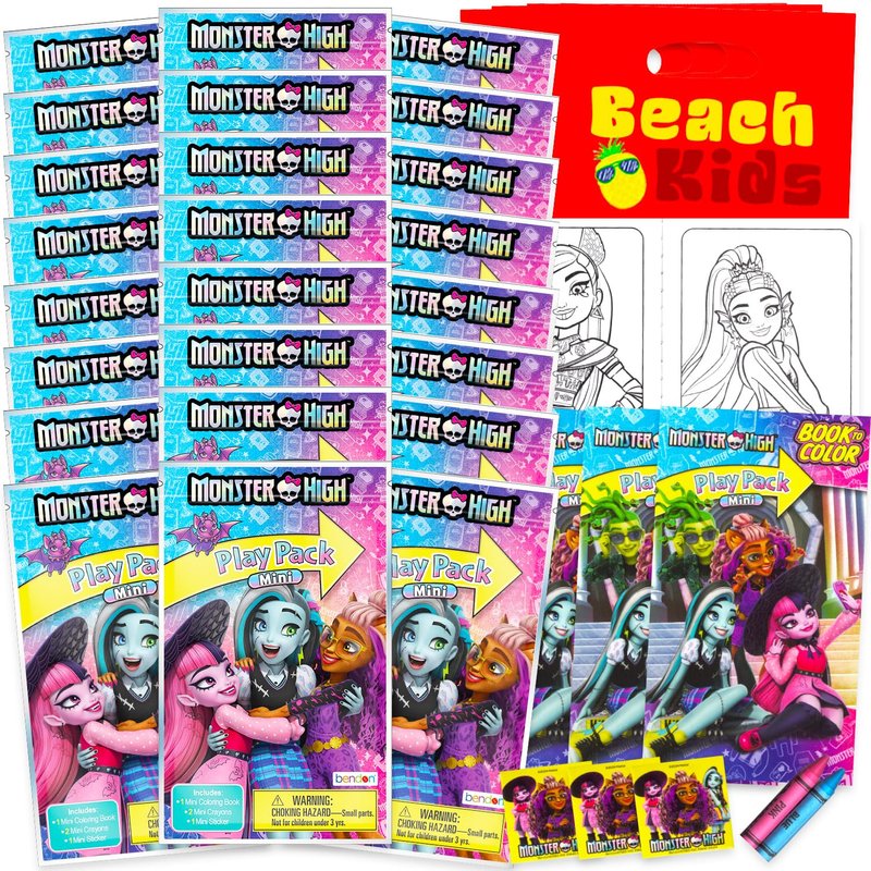 Crenstone Exclusive Monster High Mini Party Favors Set for Kids, Girls - Bundle with 24 Monster-Girl Play Packs with Coloring Pages, Stickers, More (Monster High Birthday Party Supplies). This Monster High birthday party supplies set features 24 mini Grab n Go Play Packs which each include a miniature coloring book, stickers, and coloring utensils. Sure to delight, Monster High Play Packs are great to use as party favors, party supplies, goodie bag fillers, non-candy Halloween treats, trick or treat goodies, as part of a gift set and more. These Grab n Go Play Packs will pair perfectly alongside any other Nick Jr or Shimmer and Shine merchandise featuring favorite characters from the show including Melody Carver, Frankie Stein, Clawdeen Wolf, Cleo de Nile, Draculaura and Lagoona Blue. Officially licensed Monster High party favors for kids. Comes with bonus Crenstone Exclusive Beach Kids loot bags.