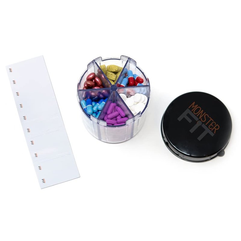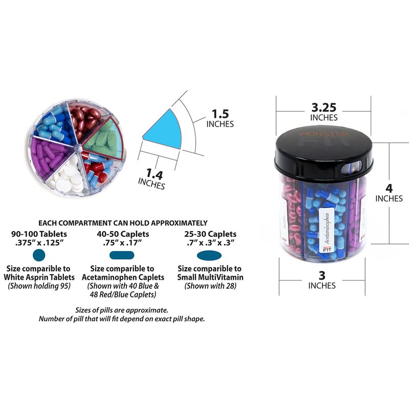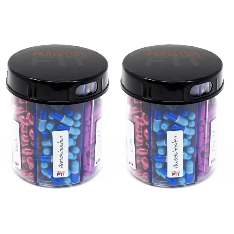 - 2 PACK DISPENSE ALL YOUR MEDICATION FROM ONE BOTTLE Our Monster Jr pill dispenser has 6 compartments that can accommodate most small - medium size pills - no more opening several bottles every time you need to take your pills