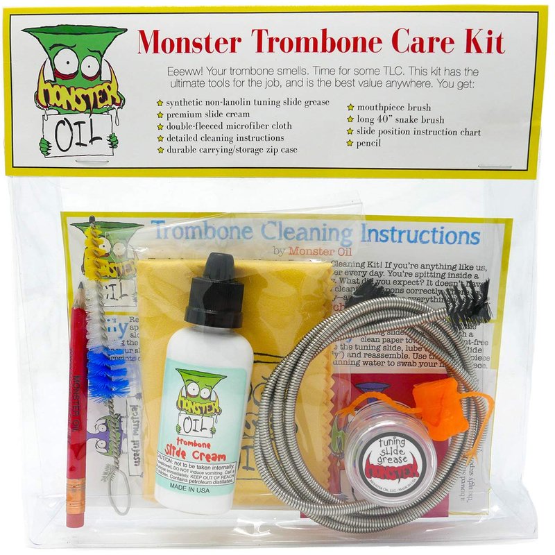 - ITEMS INCLUDED: trombone slide cream, tuning slide grease, snake brush, mouthpiece brush, polishing cloth, resealable bag, pencil, cleaning instructions, fingering chart, monster finger puppet, sticker, and a bookmark of musical terms!