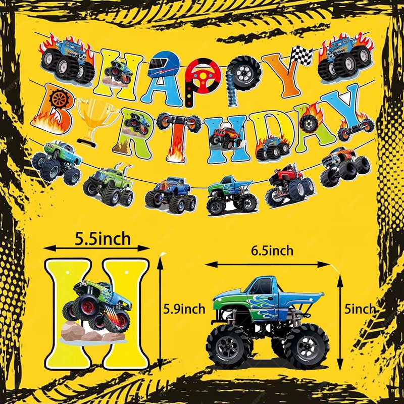 - 【Monster truck themed design】Perfect truck birthday party supplies for kids and families. The birthday banner and the backdrop can be used to decorate your walls, windows or hall. This Monster Truck party supplies will make your party more interesting. It will be an unforgettable birthday party for kids who like truck.
