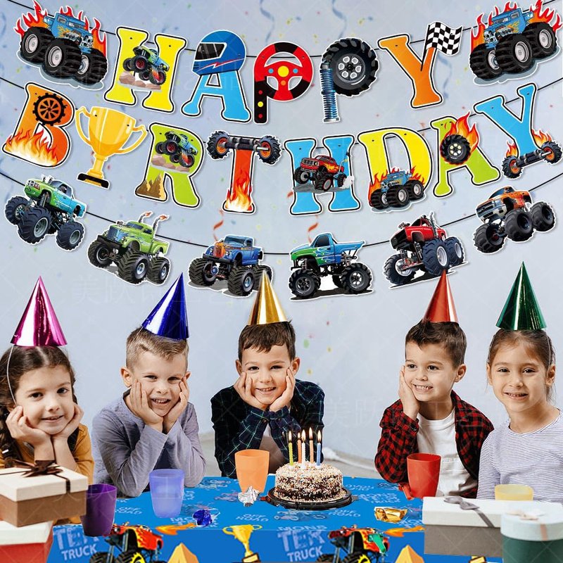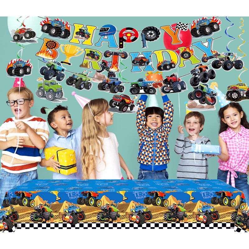 Monster Truck birthday Decorations Party Supplies include 2Pcs Tableclothes,Birthday Banner,Hanging Swirls,Stickers &Garland (Monstertruck)