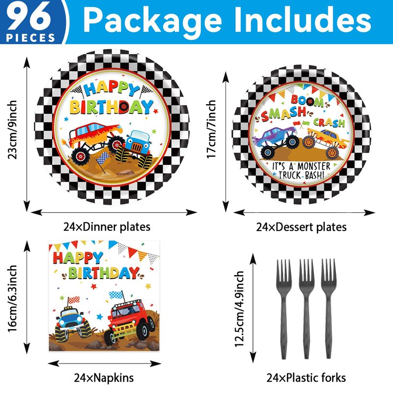 - What you get: You will receive a Monster truck party dinnerware set, including 24 x 9 inch paper plates, 24 x 7 inch paper plates, 24 x napkins and 24 x black forks, a fun and happy way to serve 24 guests bring joy to your monster truck party.