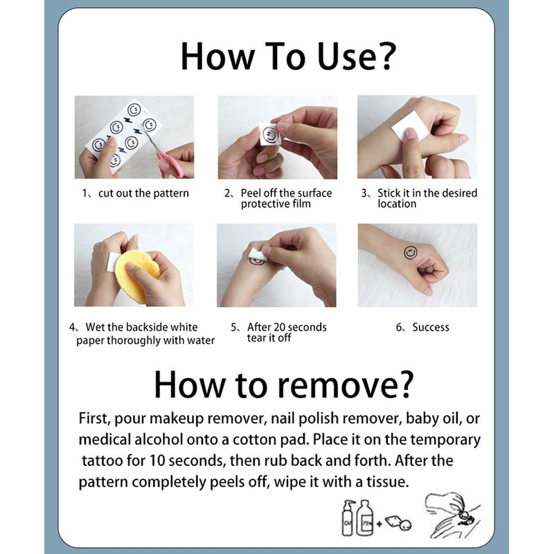 • 【Easy to Apply and Remove】 Keep your skin clean and dry, cut out one chosen pattern and remove the clear film, and then place the tattoo face down on skin. Wet the tattoo thoroughly with water, gently pat and wait about 10 seconds. Remove the back paper to let the tattoo be dry. If you want to remove the tattoos, just soak cotton pad with baby oil and pat over tattoos. Wait 10 seconds and gently rub away the tattoo with cotton pad.