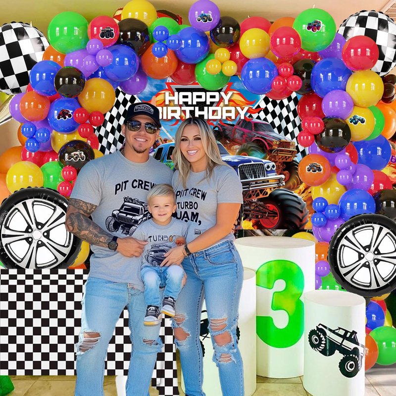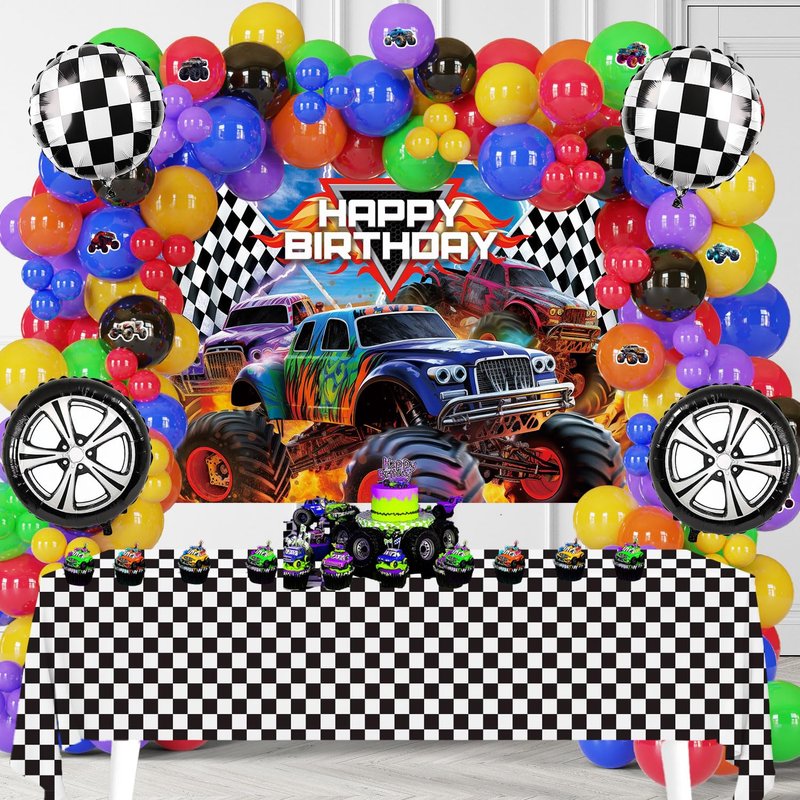 - Monster truck rally party supplies: This 85-piece monster truck themed balloon kit is designed to transform any party space. It includes various balloons in matte deep blue, purple, red, yellow, orange, and green,black,plus unique racecar and checkered flag aluminum balloons for an authentic racing atmosphere.