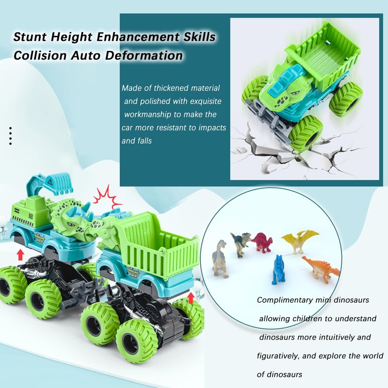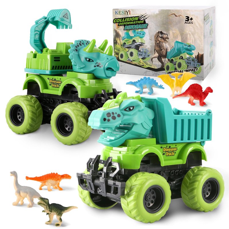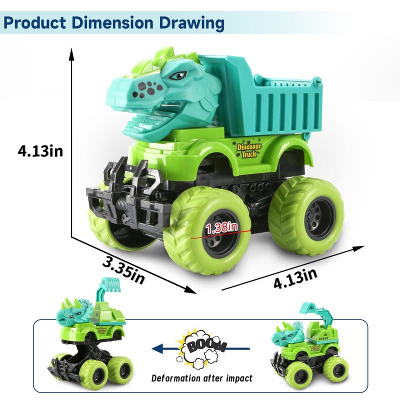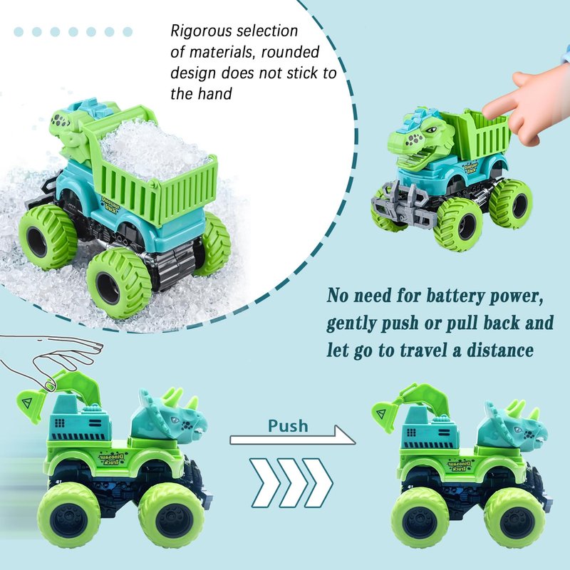 - 【Dinosaur toys for kids 2-4】:When kids play monster trucks with their friends, not only they can have a fun time, but also develop children's motor skills and hand-eye coordination, which is an effective way to develop their social and communication, These monster truck also offer an ideal opportunity for parents to engage fully with your children