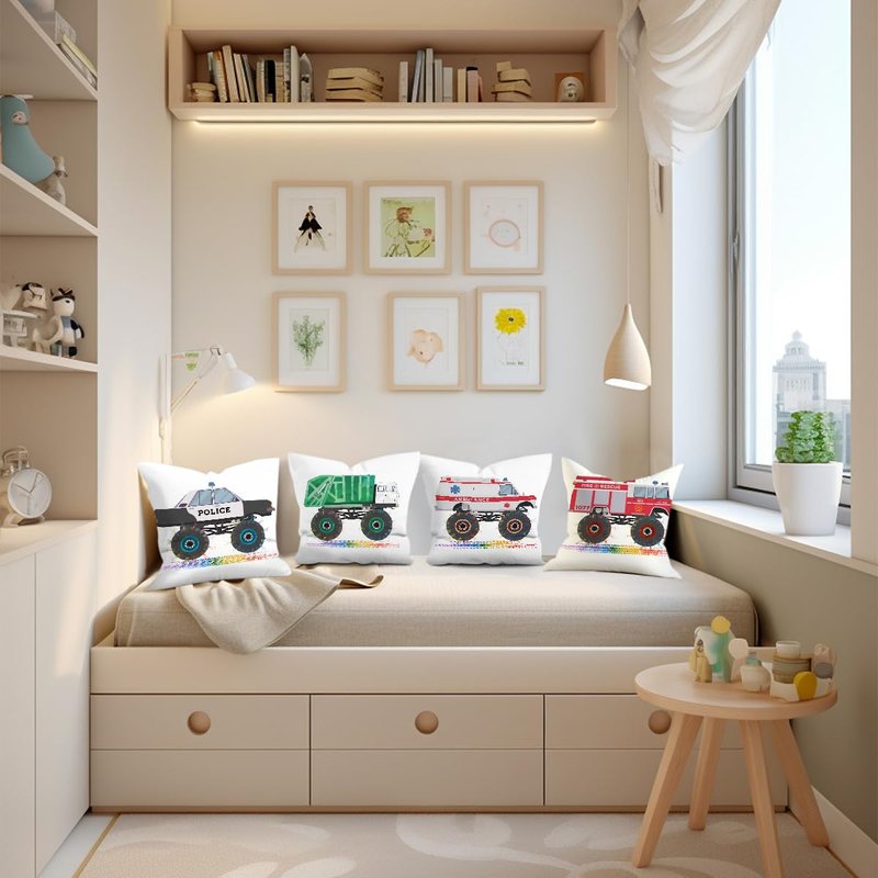 Monster Trucks Pillow Covers, Throw Pillow Covers 18x18, Pack of 4 Zipper Pillow Cases, Firetruck Garbage Truck Ambulance Police Car Pillow Protectors, Bed Playroom Nursery Boys Room Decor Pillowcase