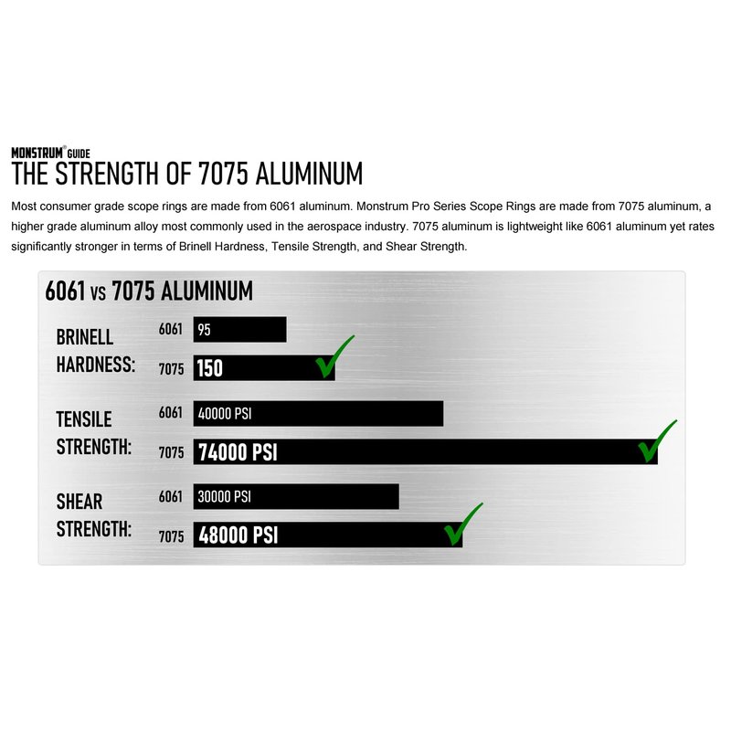 - Monstrum Pro Series scope rings are crafted from 7075 aerospace aluminum - providing greater tensile strength, shear strength, and Brinell hardness than typical 6061 aluminum scope rings