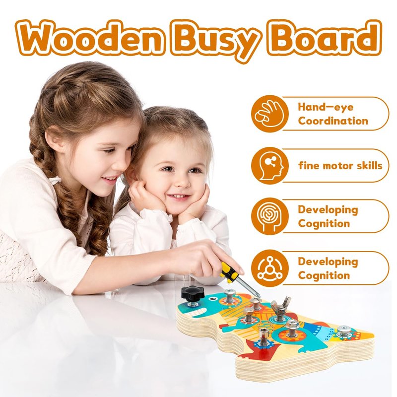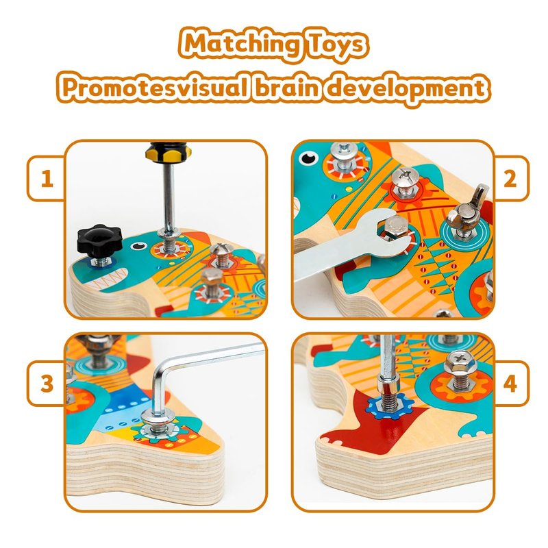- FUN DINOSAUR BUSY BOARD: This tool set for kids includes the outer octagon, Phillips, hexagonal socket and large hexagonal socket, your child can safely practice removing and re-inserting the 8 different insertion screws, immersing your child in role-playing games, practicing hands-on skills and life skills, which is a creative and fun process!