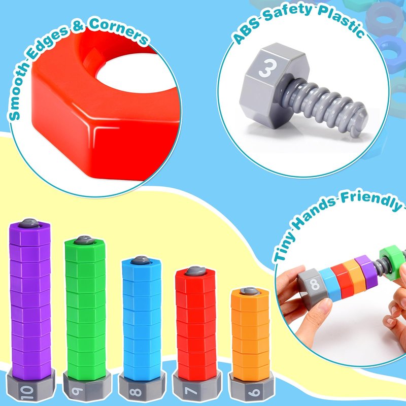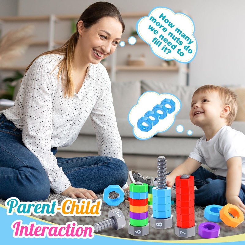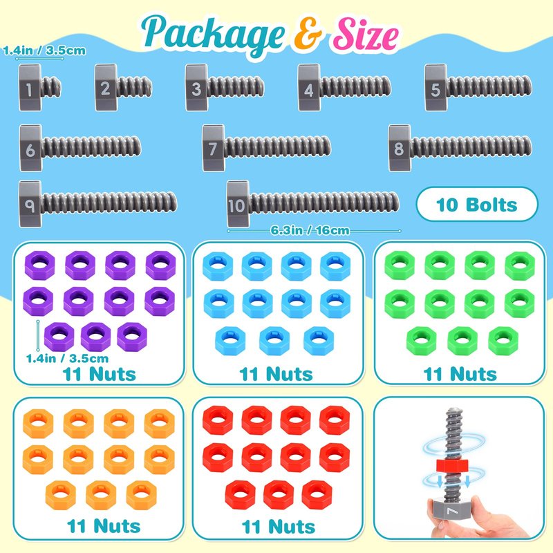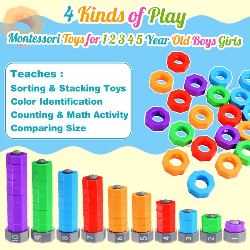 - Great Montessori Stacking Toys: Montessori toys for toddlers set includes 10 bolts & 55 nuts. Kids just choose a bolt featuring a numeral from 1 to 10 and twist on the matching number of nuts. The molded plastic nuts and bolts feature a quick-release design that makes it a cinch to remove the nuts and start again