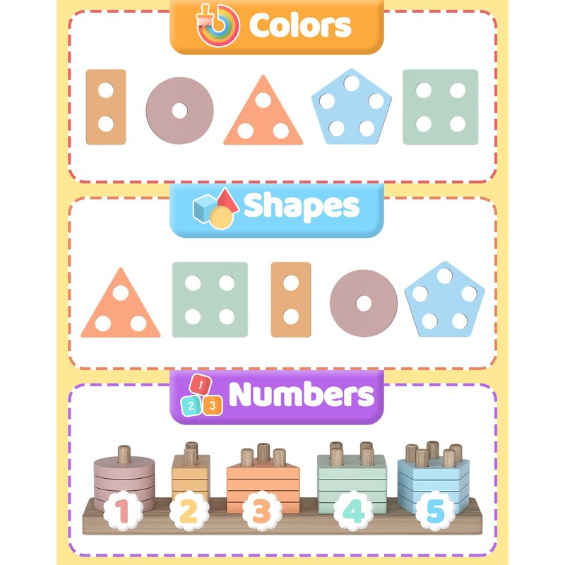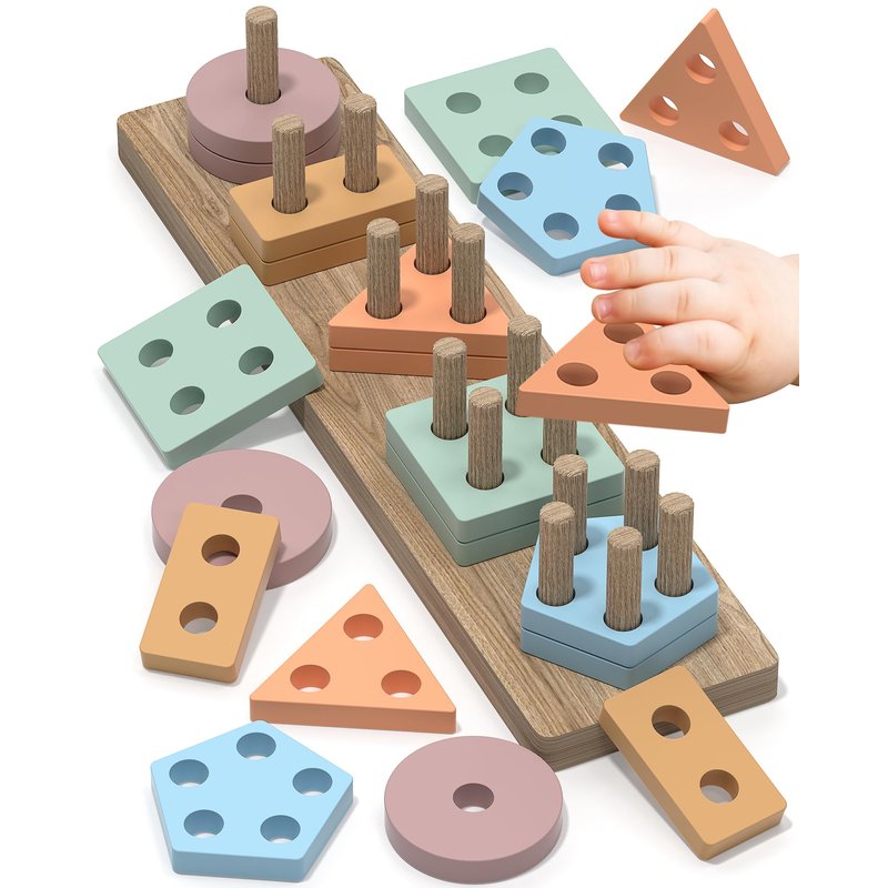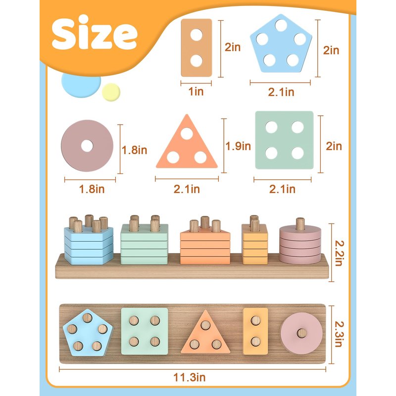- Toddlers Design: Montessori toy for ages 1 2 year old girl boy is a simple game that involves mounting one piece on another. The geometric blocks are the same size, but different in color and shape. This activity helps your child control their body movements, coordinated with stacking and sorting activities! This learning educational toy is perfect for your child to learn shapes and geometry, build color recognition and exercise your child's concept of space.