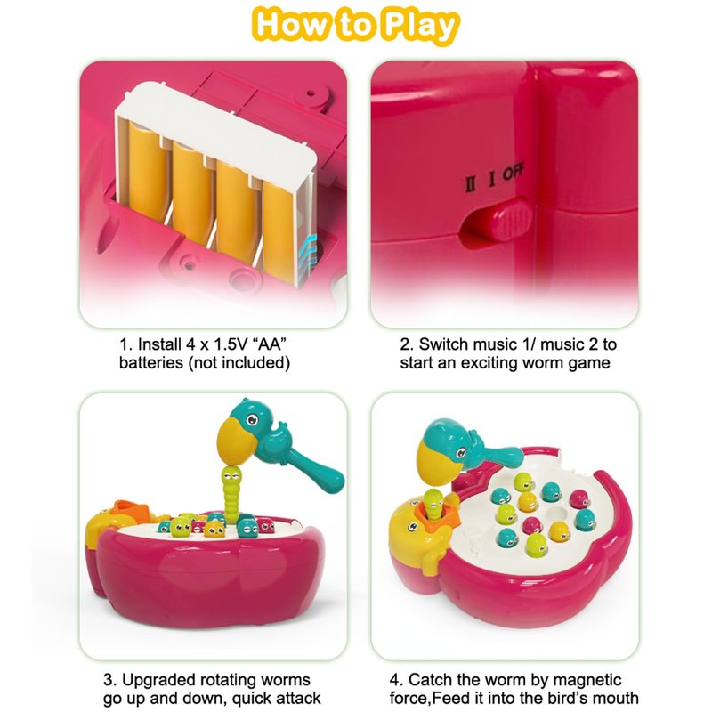 - 【FUNNY MAGNETIC TODDLER GAME】This engaging toddler toy offers two ways to play: one is offering a magnetic bird feeding game for kids to catch worms and feed them to the bird.Another is whack a mole game, kids could whack the worms with the little bird hammer