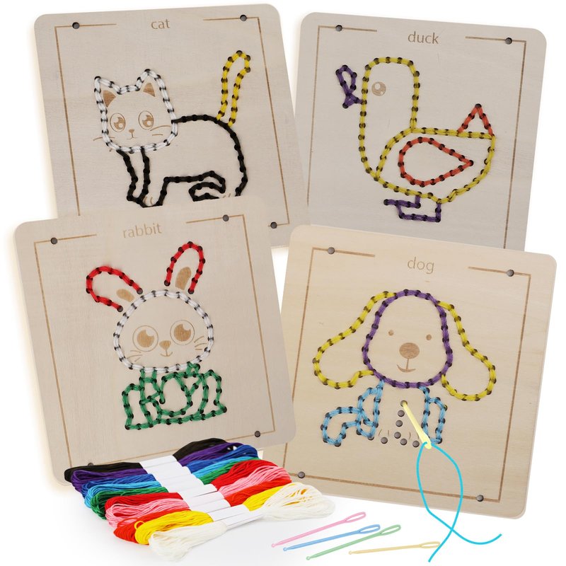- Montessori Toys: Featuring 4 unique wooden lacing templates, 10 vibrant colors of yarn, and 4 plastic threading needles, offering a rich hands-on exploration and creative experience. As toddlers thread the colorful strings through the holes in the wooden boards, they develop hand dexterity, finger strength, and hand-eye coordination. These skills are crucial for future tasks such as writing, buttoning clothes, and using utensils.