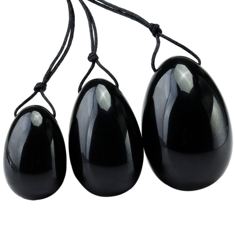 mookaitedecor Black Obsidian Yoni Eggs Set of 3, Predrilled with Unwaxed String, Massage Stones for Women to Strengthen Pelvic Floor Muscles with Velvet Pouch