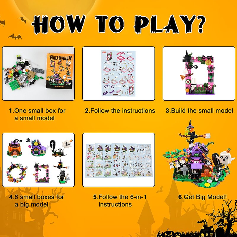 - 【6 in 1 Building Blocks Design】Our 6-in-1 Christmas building blocks set includes 603 pieces, which can be assembled to 6 Halloween theme models-pumpkins, ghosts, witches, Halloween wreath, candy house and photo frame.These 6 small models can be reassembled to a lager Haunted house. It’s a great activity to create a magical Halloween scene and bring great fun.