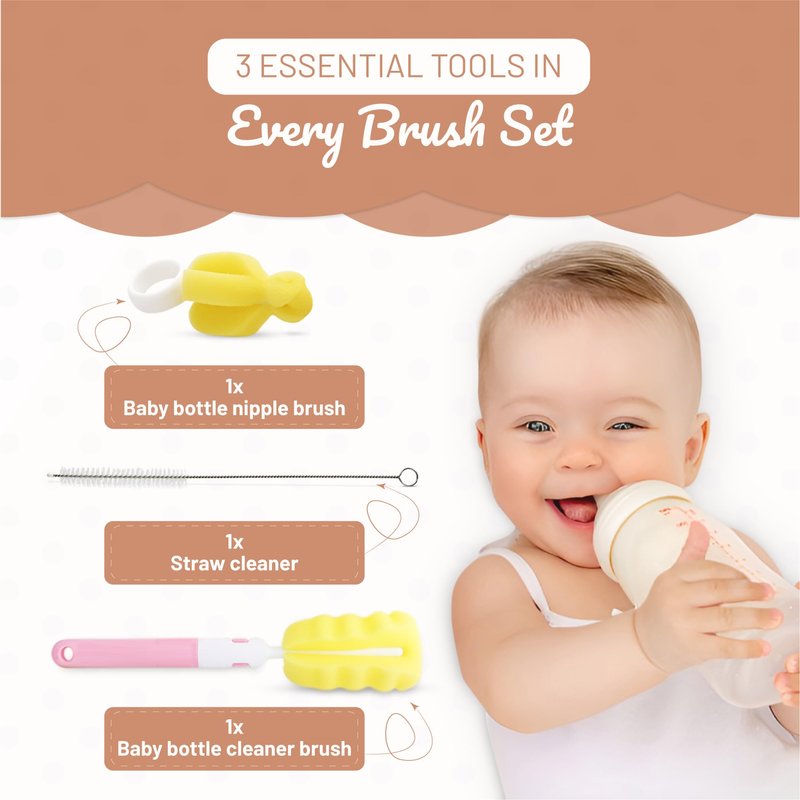 - Complete Baby Bottle Brush Set - Our bundle includes a special baby bottle cleaning brush, a nipple brush, and a straw cleaner, ensuring every nook and cranny of a bottle or sippy cup is thoroughly cleaned.