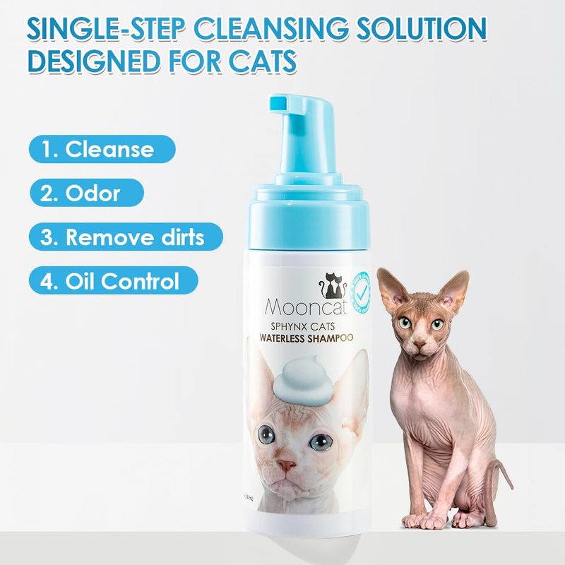 Why Mooncat Waterless Cat Shampoo Unlike traditional baths, which are stressful for most cats, our waterless shampoo is designed to create a comfortable, spa-like experience for your cat from the comfort of your home.In alignment with Mooncat's values, we include only the safest, high quality ingredients. Our in-house formula helps moisturize and rejuvenateyour cat's fur and skin while dissolving any oil and impurities. After every wash your cat's coat will be softer and smoother, making it easier for you to comb and maintain.My cat is very dirty with dried solids in its coat. Would this shampoo be suitable Mooncat Waterless Cat Shampoo was designed for light maintenance washes. If your cat is heavily soiled, then we recommend you try our Mooncat Natural Foaming Shampoo.My cat is "X" years old and "X" breed. Is this shampoo suitable?Mooncat Waterless Cat Shampoo will deliver powerful results for any type of cat no matter the breed, hair length, fur type, or age.How does the shampoo work? Do I need water?There is no need for water or rinses. Just apply the shampoo to your cat, massage it in, wipe with a towel, and gently blow dry.How often should I use this shampoo?We generally recommend using Mooncat Waterless Cat Shampoo once a week, though this will also depend on your cat, climate, and other factors.The Mooncat WayAt Mooncat we believe your cat is an equal member of your family. This is why we include luxury ingredients that make our shampoos even better than some human shampoos. This way your cat can enjoy their wash just as much as you do.