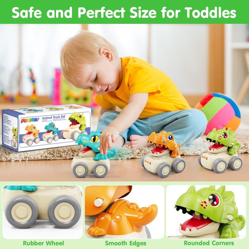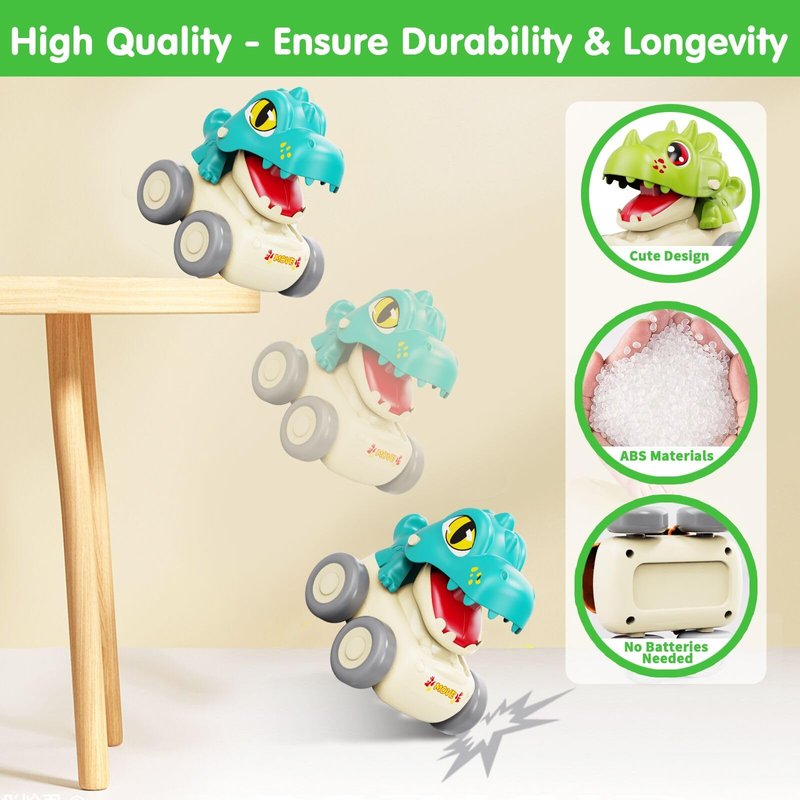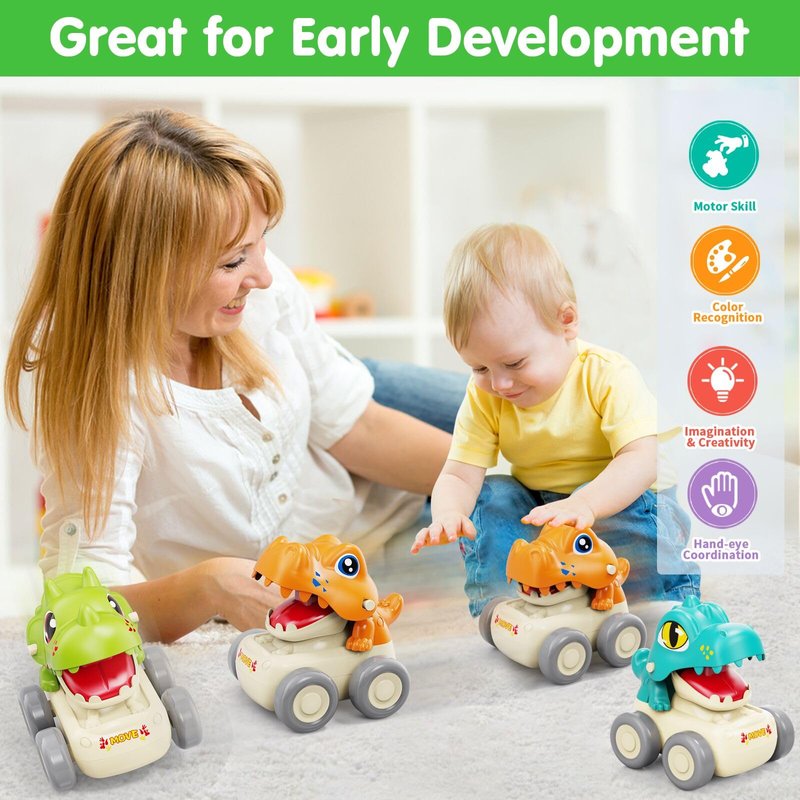 - Funny Press and Go Cars: Our 3 unique animal toy cars are easy and enjoyable for young children to play with. No batteries are required, just press down on the dinosaur car's head and watch it run! Easy to play, let the races begin! They are great learning toys for ages 0-2 boys and girls to improve their motor skills.