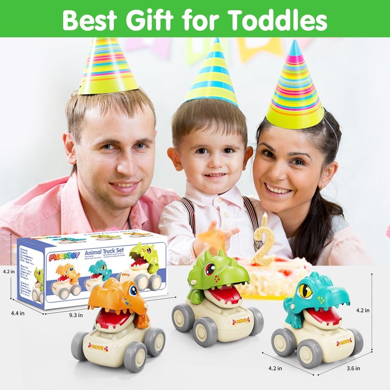 - Awesome Gift for Toddlers and Babies : If you're looking for a fun and engaging gift for a young child, our baby dino car toy is an awesome choice. With its engaging features, captivating design, and nice gift package, is perfect as a first birthday gift, party favors, stocking stuffers, and all kinds of festivals (Easter, Christmas, Halloween, Thanksgiving, New Year). 3 animal trucks toys, playing with your kids to increase parent-child interaction.