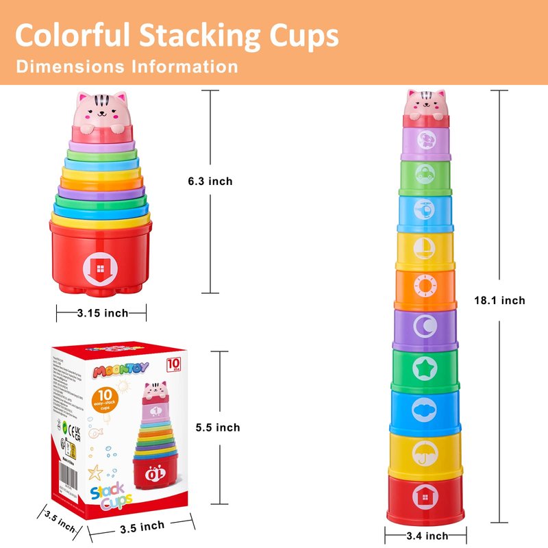 - Baby Stacking Toys for Babies 6-12 Months: Stacking cups for toddlers 1-3 have brightly colored items that catch baby’s attention and stimulate their imagination. The stacking cups boy girl toys set includes 10 colorful stackable toys cups plus 1 cute cartoon cat head-shaped cup. It is light in weight and will not hurt the baby, the size of cups is specially designed for the baby’s hand and is easy to grab and stack. It introduces the concept of color and size for babies and toddlers.