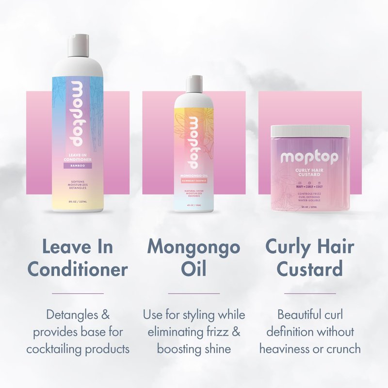 - LEAVE-IN CONDITIONER, MONGONGO OIL, CURLY HAIR CREAM, & CURLY HAIR CUSTARD. Lock & load your hair with moisture, shine and touchable definition with MopTop’s special curly hair products.