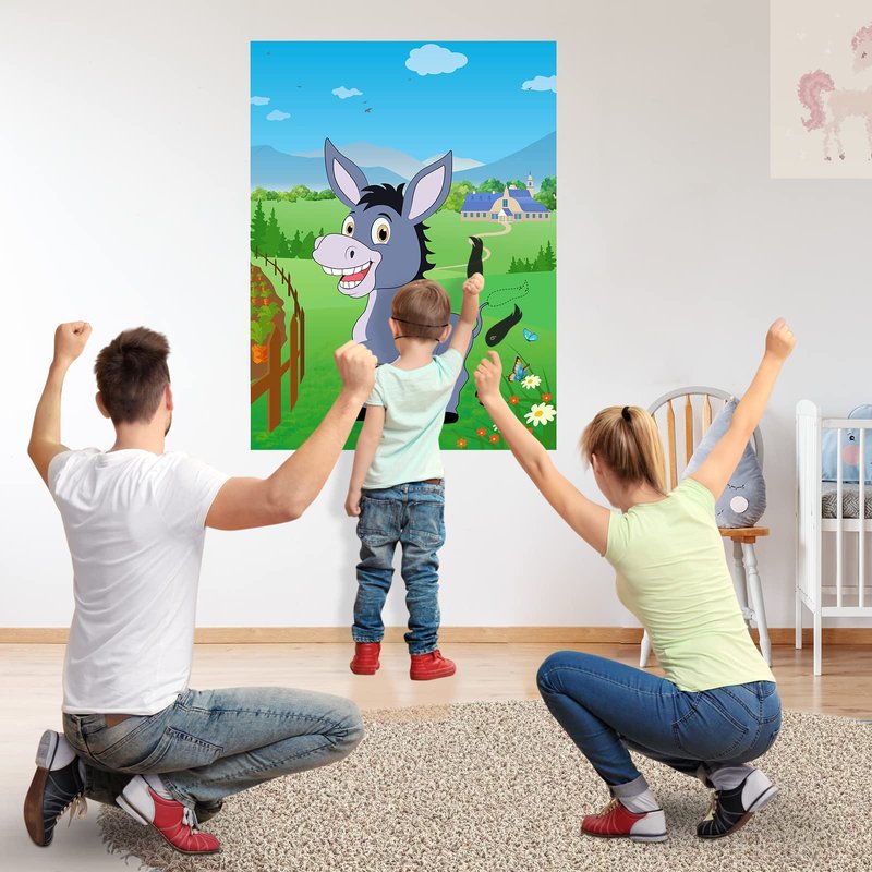 - How to play: paste the poster on the wall with dot glues, then take turns wearing blindfolds and pinning the tails on the donkey,whoever pins closest wins.
