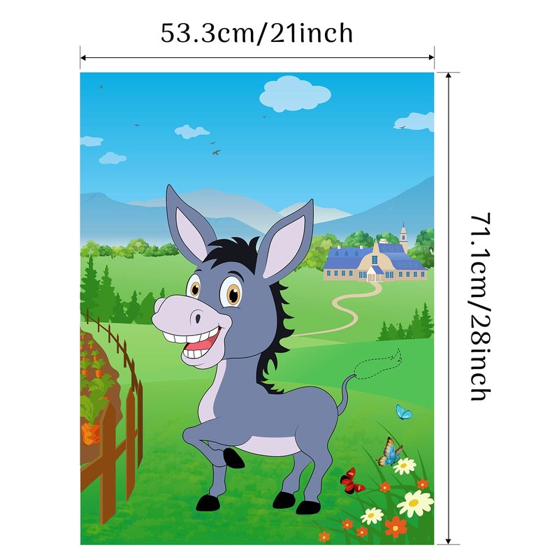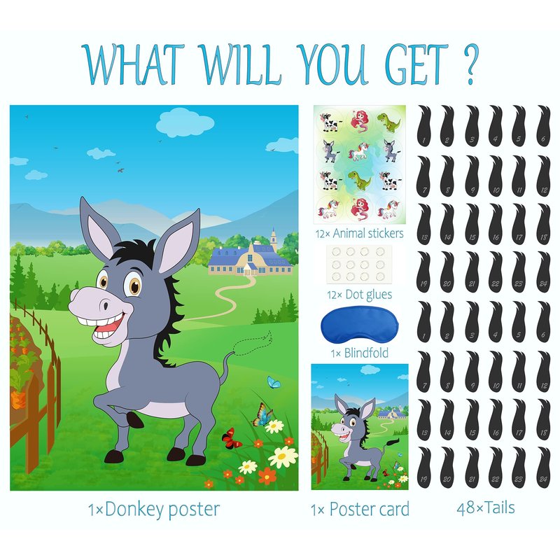 Pin the tail on the donkey game pack is suitable for children as a birthday present. Products include: 1 28×21 inch high gloss waterproof papery donkey game poster. 48pcs black self-adhesive sticker tails. 1 blue fabric soft blindfold. 12 dot glues for sticking posters. 1 sheet animal stickers for the winner of the donkey game or as decorations. 1 10.5×7 inch cardstock poster for decoration. Notice: Poster dot glues are more suitable for wood and tile walls, if sticking on painted walls, please pull gently when removing to avoid damaging the paint. Please keep away from open flames.