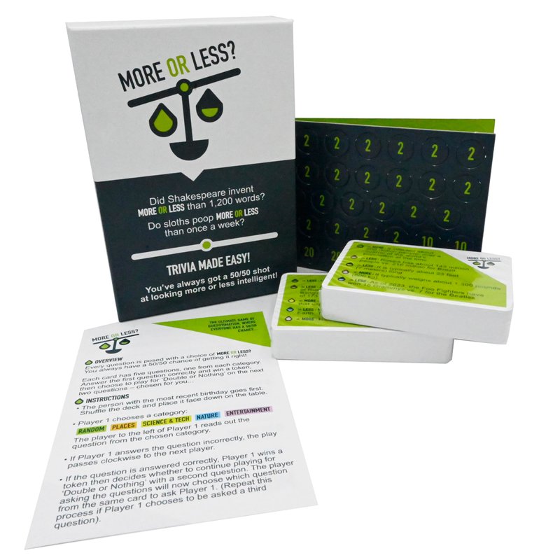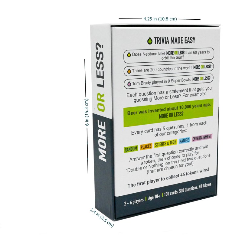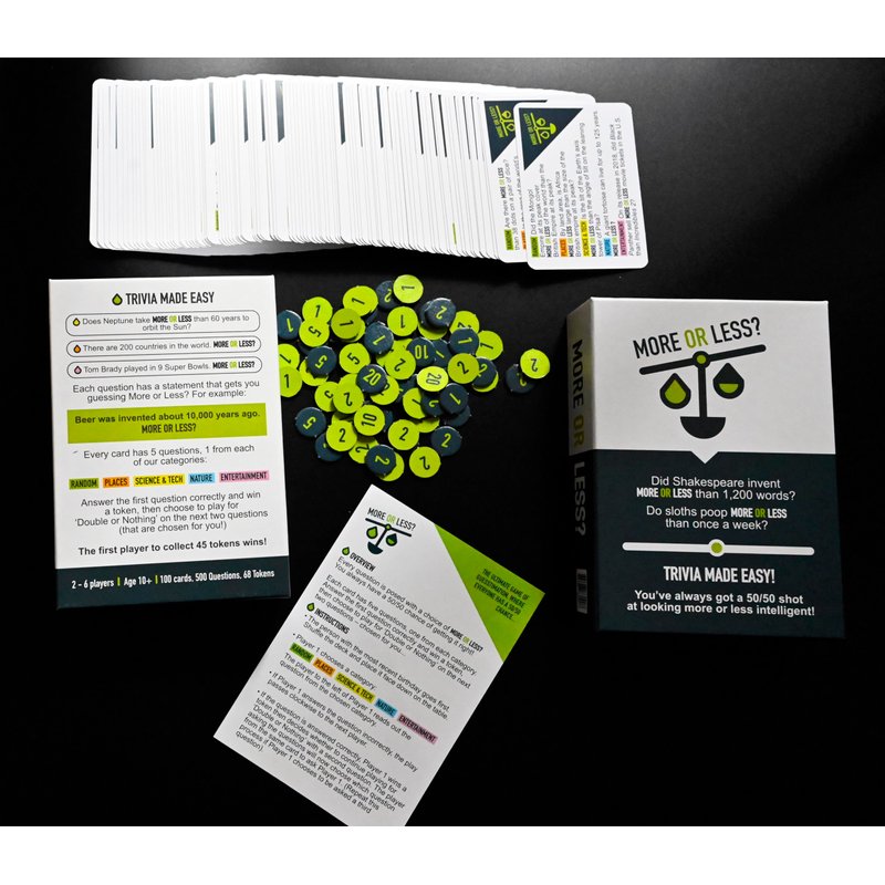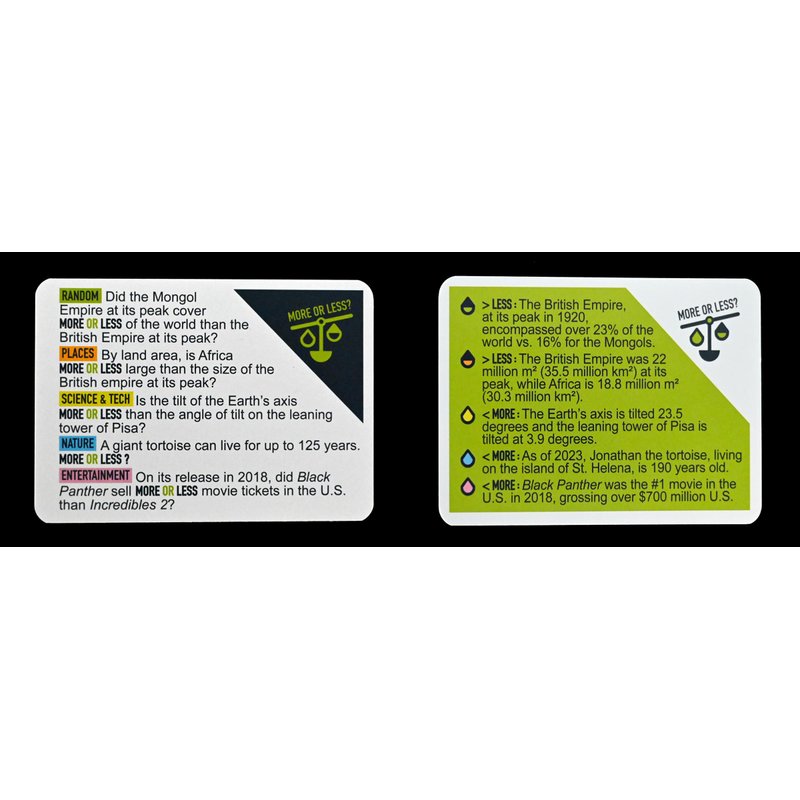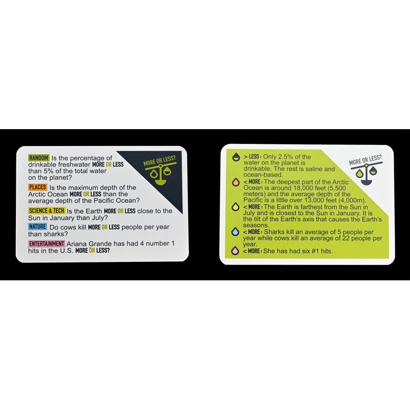 - Fun: Sharpen your wits with each question! "More Or Less?" provides a learning opportunity with every card, challenging players with interesting facts and scenarios across 5 diverse categories.