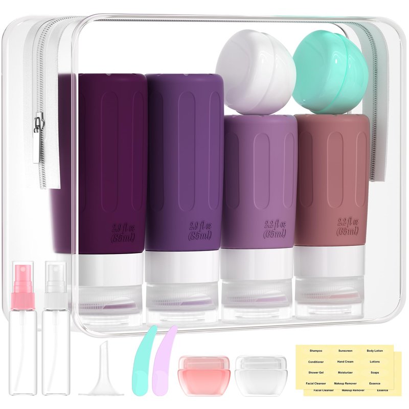 - 【REUSABLE TRAVEL BOTTLES SET】This is a nice assortment of travel containers in a useful zip case. ( Come in 4 Bottles+4 Jars+2 Spray Bottles+2 Scoopers+1 Funnel+1 Clean Brush + 1 Page Label + 1 Bag ) Multiple ones allow you take along different beauty products and toiletries according to your requirement