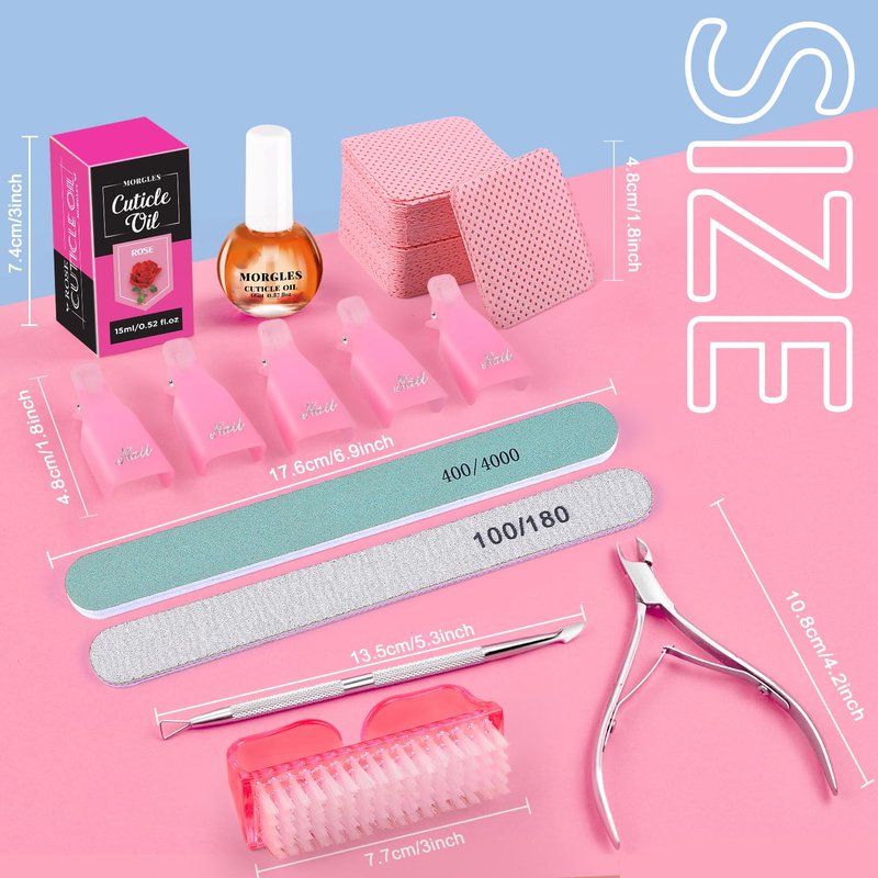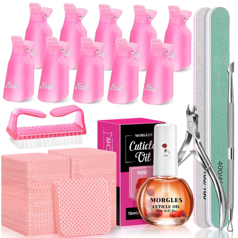 MORGLES 316pcs Gel Nail Polish Remover Kit: 10pcs Nail Polish Remover Clips, 300pcs lint-free nail wipes, Cuticle Pusher/Peeler/Nipper, Nail File, Nail Buffer, Nail Brush, Cuticle Oil. One set meet you all needs to soak, dissolve, and remove gel. Nail Remover Clips work well with Acetone Nail Polish Remover to soften and break down nail polish. The rose scented cuticle oil has the effect of reducing brittleness and breakage of nails, good for moisturizing and nourishing cuticles. They are great for caring for nails and cuticles. Gel Nail Polish Remover Kit is a sweet little helper for your nails!