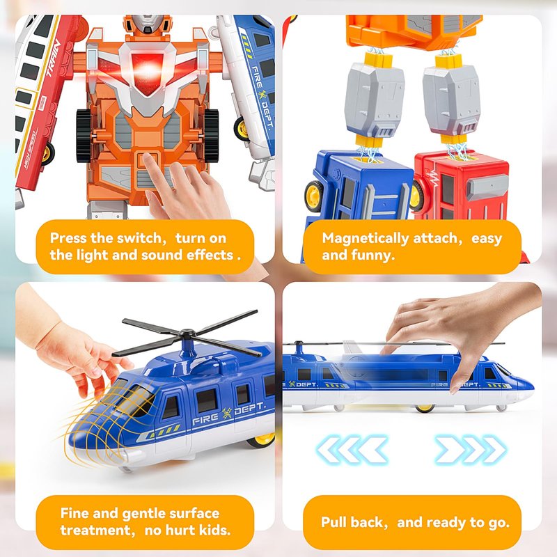 - 【5 in 1 Robot Action Figure 】: The Construction truck robot toy is composed of 5 cars: engineering vehicles,trains,fire helicopters, police cars, and ambulances. 5 construction vehicles can be assembled freely.It can be transformed into a large robot, and the toy that has transformed from a robot to a transportation vehicle has attracted several generations of children. A learning toy suitable for boys aged 3 4 5 6 7.