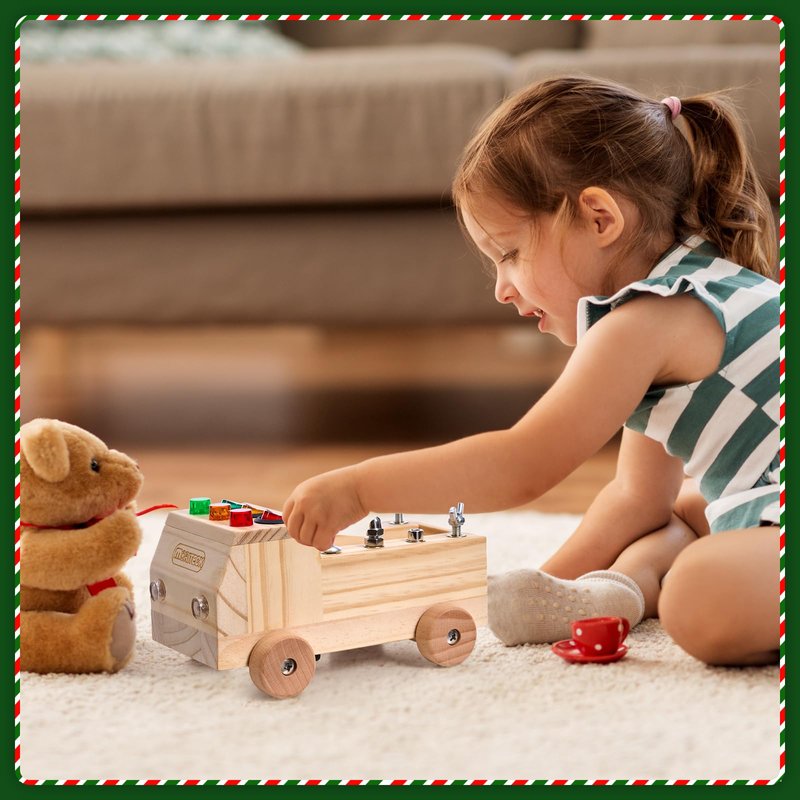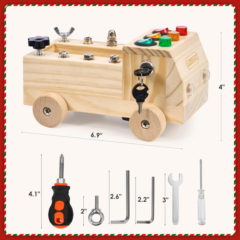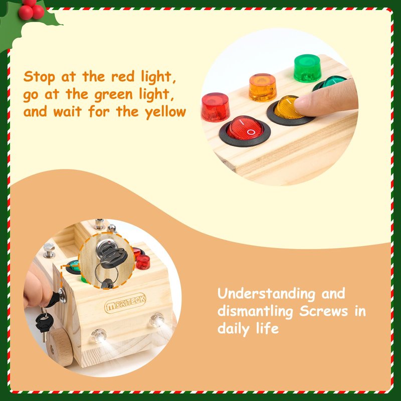 - MONTESSORI TOY: busy board in the truck shape with 4 wheels is designed with 3 different switches, each switch corresponds to a different color of LED light beads, in addition to 8 kinds of screws that are installed in different ways matching kids screwdriver, toy mini wrench and all your screws
