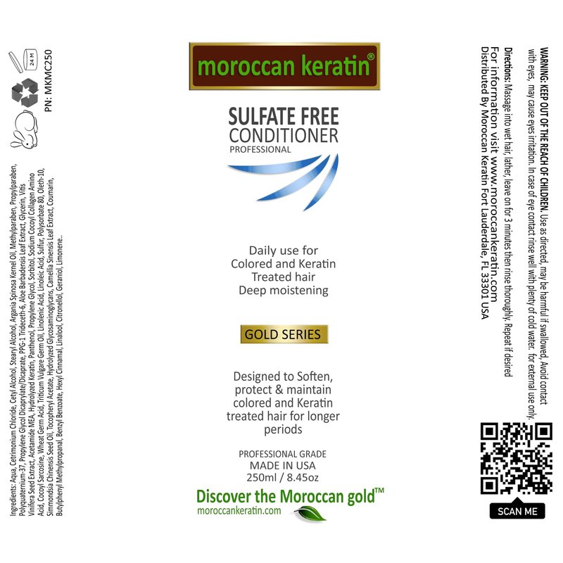 - Moroccan Keratin Sulfate Free Moisturizing Conditioner- Infused with power and goodness of Moroccan Argan oil that provides superior protection. Deeply moisturizing conditioner. Provides superior protection Nourishes, hydrates, and strengthens the hair. Restores split ends, breakage and dryness using of moisture rich ingredients, Hydrolyzed keratin & essential amino acids. Acondicionador sin sal para keratina.