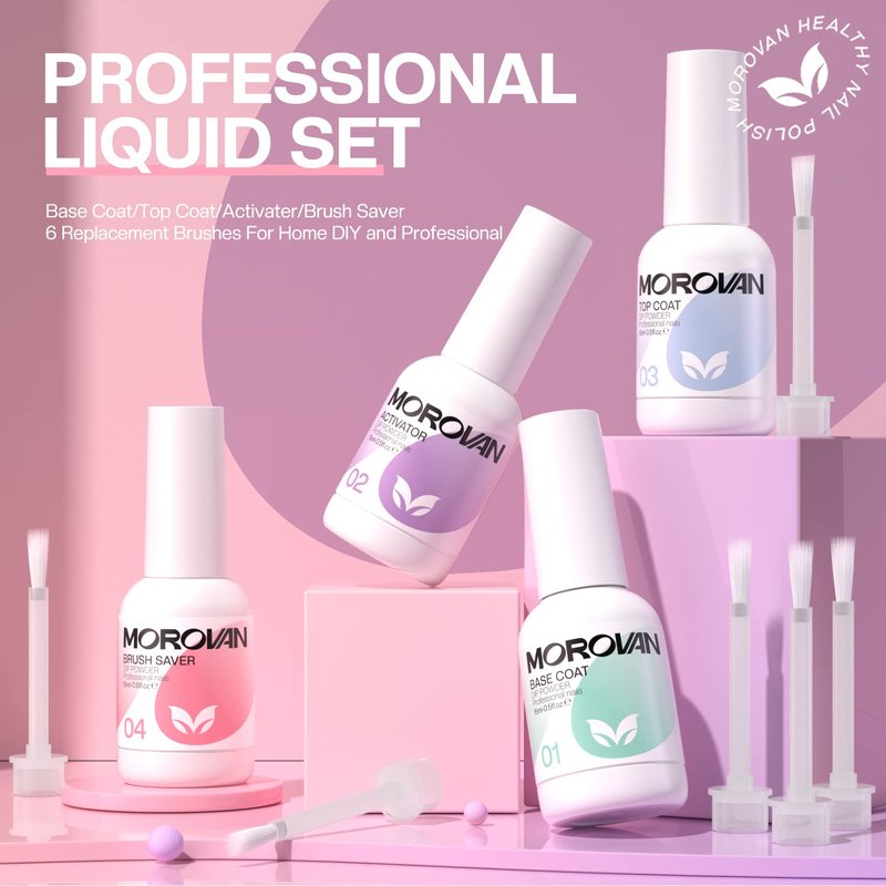 - Dip Powder Liquid Set: You will get a Base coat, Top coat, Activator, and Brush Saver (15ml / 0.5 fl oz each bottle), 4 Replacement Brushes.Morovan dip nail powder liquid set with everything you need for creative dip designs.