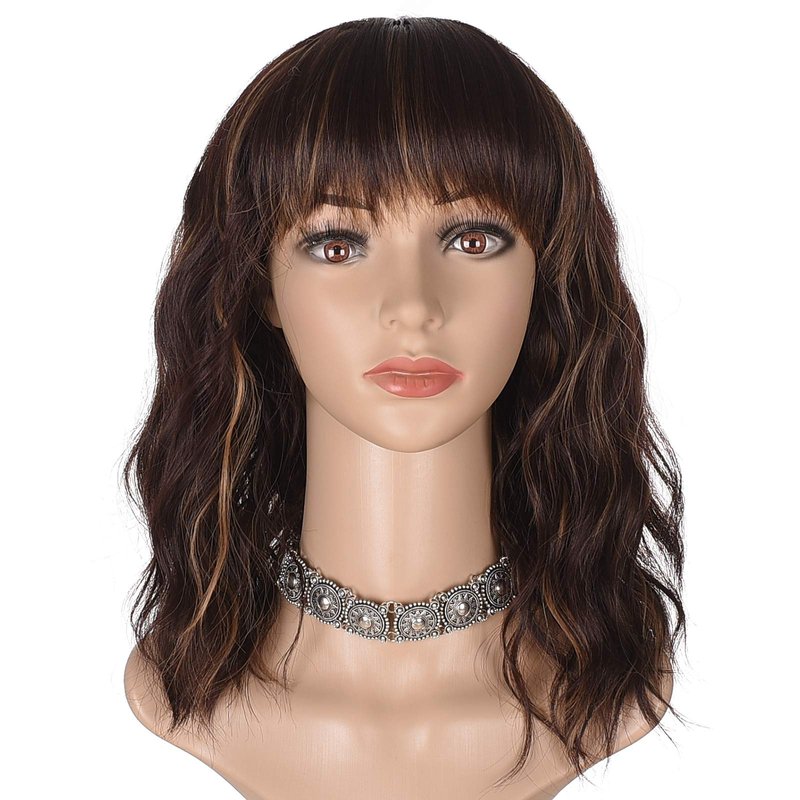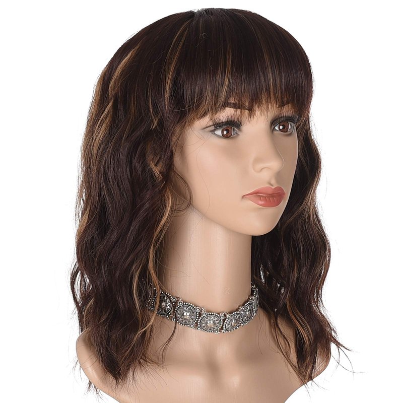 morvally Short Mix Brown Wavy Bob Wig with Bangs for Women 16 Inches Natural Synthetic Hair Wavy Wigs