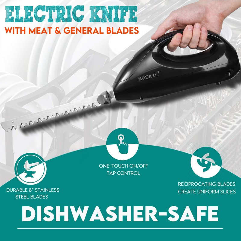 - SHARP CARVE EASILY - MOSAIC electric knife has two removable and serrated blades make your carve, cut and slice more easier. Two stainless steel serrated knife sharp and thickness.