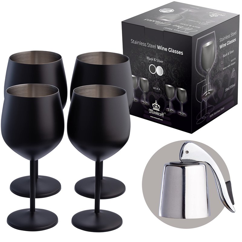 Mosscoff Stainless Steel Wine Glass Set of 4 - Black and Silver collection - 18 oz/530 ml Unbreakable Wine Glasses with a wine stopper - Portable Metal Wine Glass