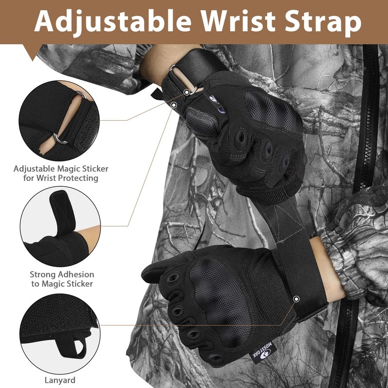 - The Right Fit: An adjustable wristband and strong adhesive magic sticker allow you to adjust your motorcycle gloves to keep them fit, preventing them from getting loose or falling off. We offer all three sizes of these hunting gloves for you to find the perfect fit for good performance. Please Take the time to get actual measurements and check the airsoft glove sizing chart.